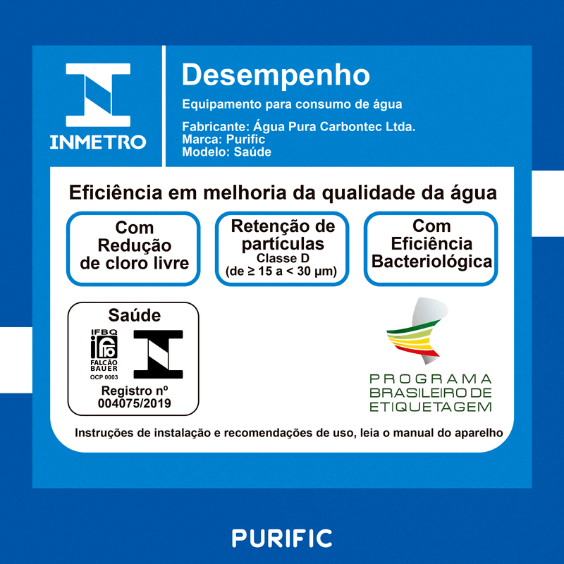 Produto livre de BPA e PP-BIP-F: segurança confirmada por cromatografia gasosa e espectrometria de massas (NBR 15176:2004).Ficha Técnica | Purific 20 com Refil Low Flúor